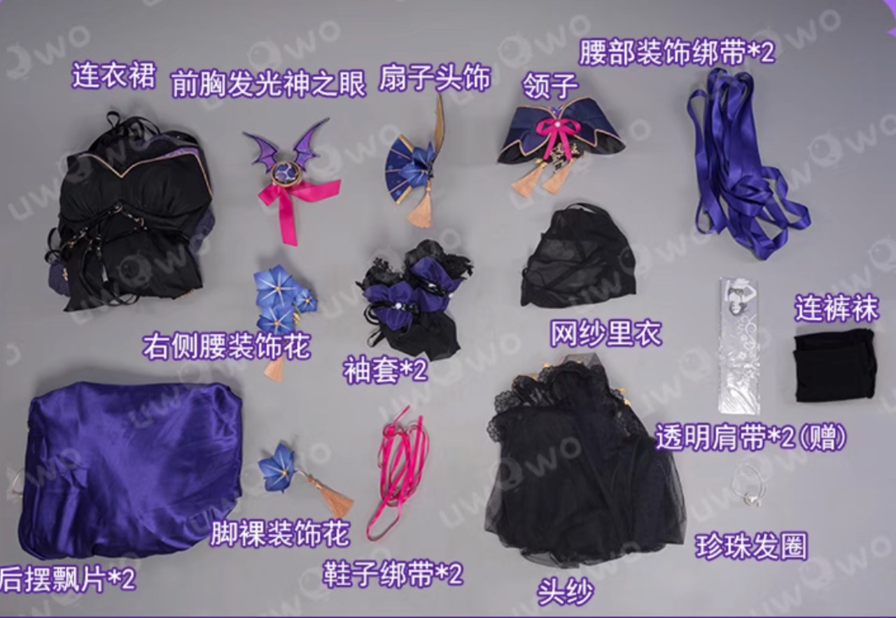 セット内容:コスプレ衣装(雷電将軍サキュバスモデル)、肌着、アクセサリー