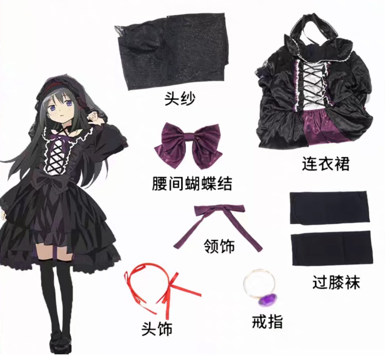 セット内容:コスプレ衣装(暁ほむらモデル)、アクセサリー